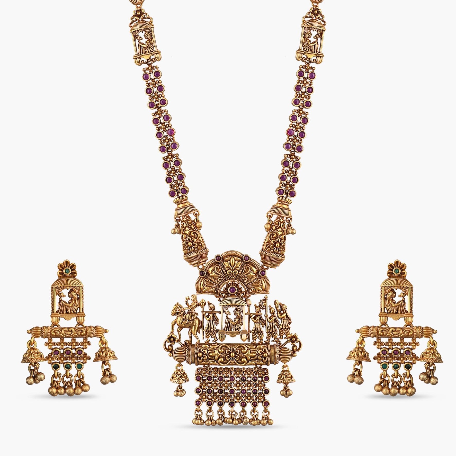 Behold this spectacular designer long necklace set by Tarinika. Inspired by the classical chariots from Indian weddings and crafted meticulously, this long necklace is made from high-quality kempu stones and antique gold plating to give a classic royal look.