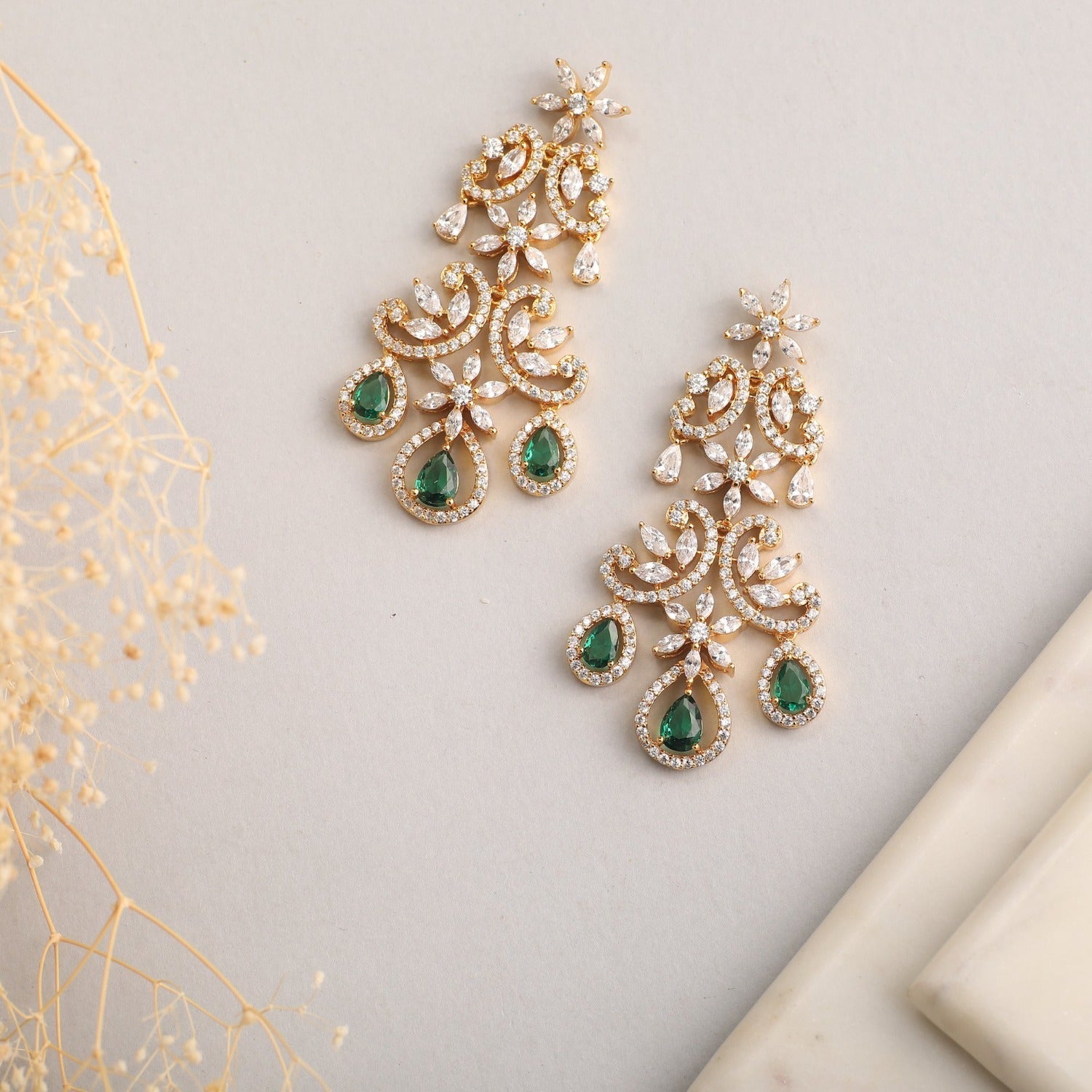 These beautiful drop earrings celebrate the magic of Holiday scenery. Featuring floral detail at every angle, these precious earrings are a modern take on a rich jewelry heritage. Wear it alone, or style with bangles and necklace from the Nakshatra CZ family.