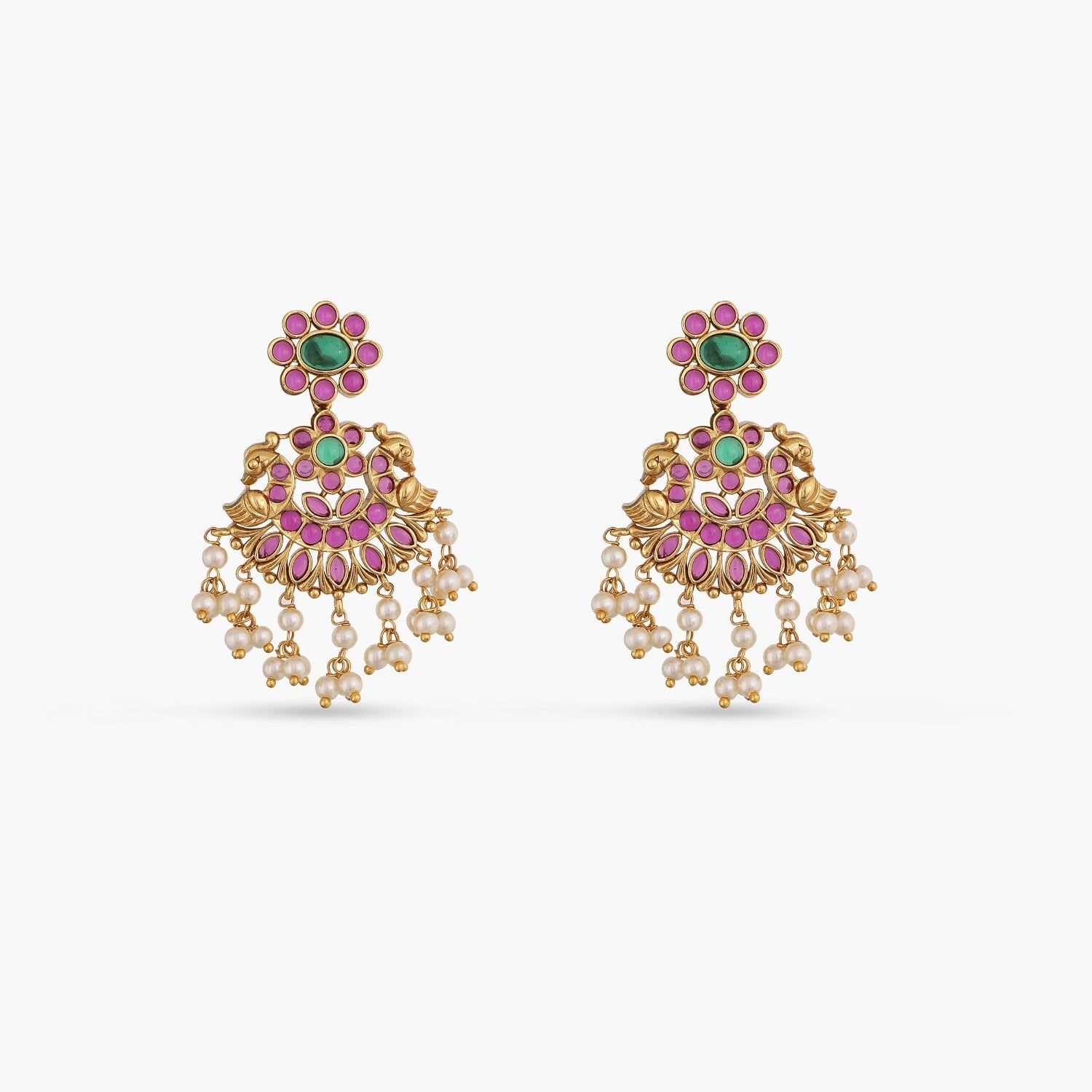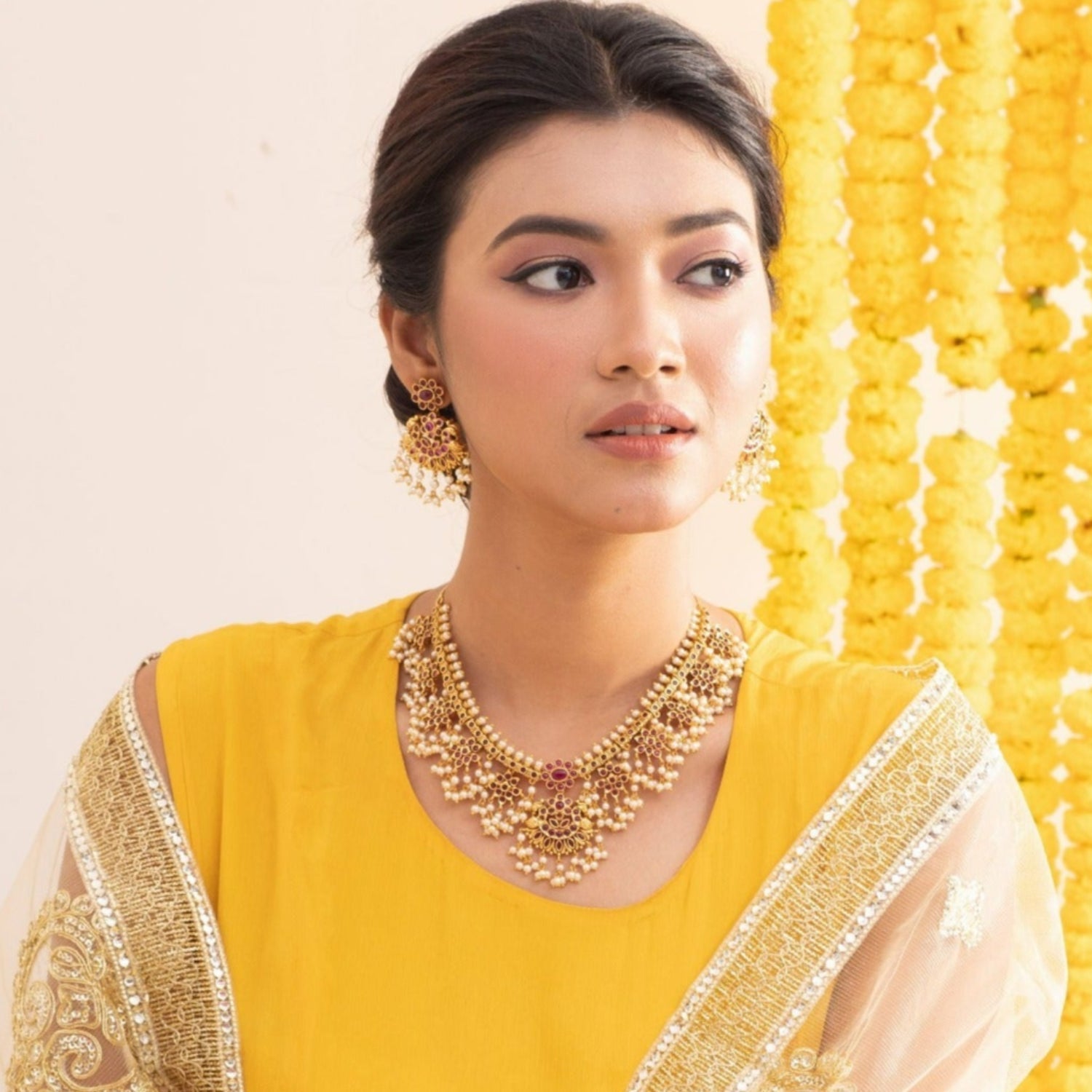 Inspired by the famous south Indian Guttapusalu craft this pearl cluster necklace set is a classic collection from Tarinika. Carved on the antique gold-plated base this Kemp stone studded necklace is a great choice for exotic Indian jewelry love. Pair this with your saree or ethnic dress for the festive-ready look.
