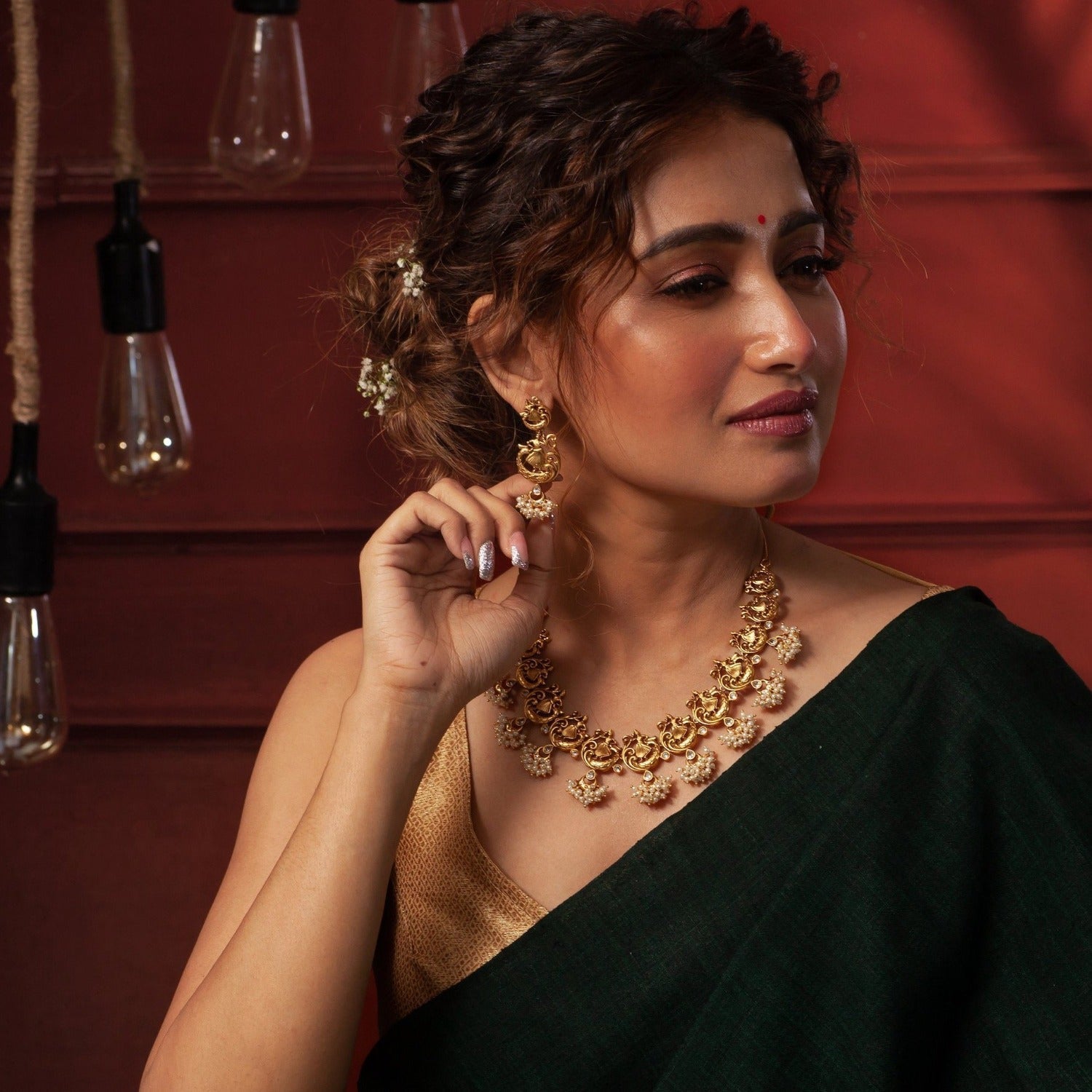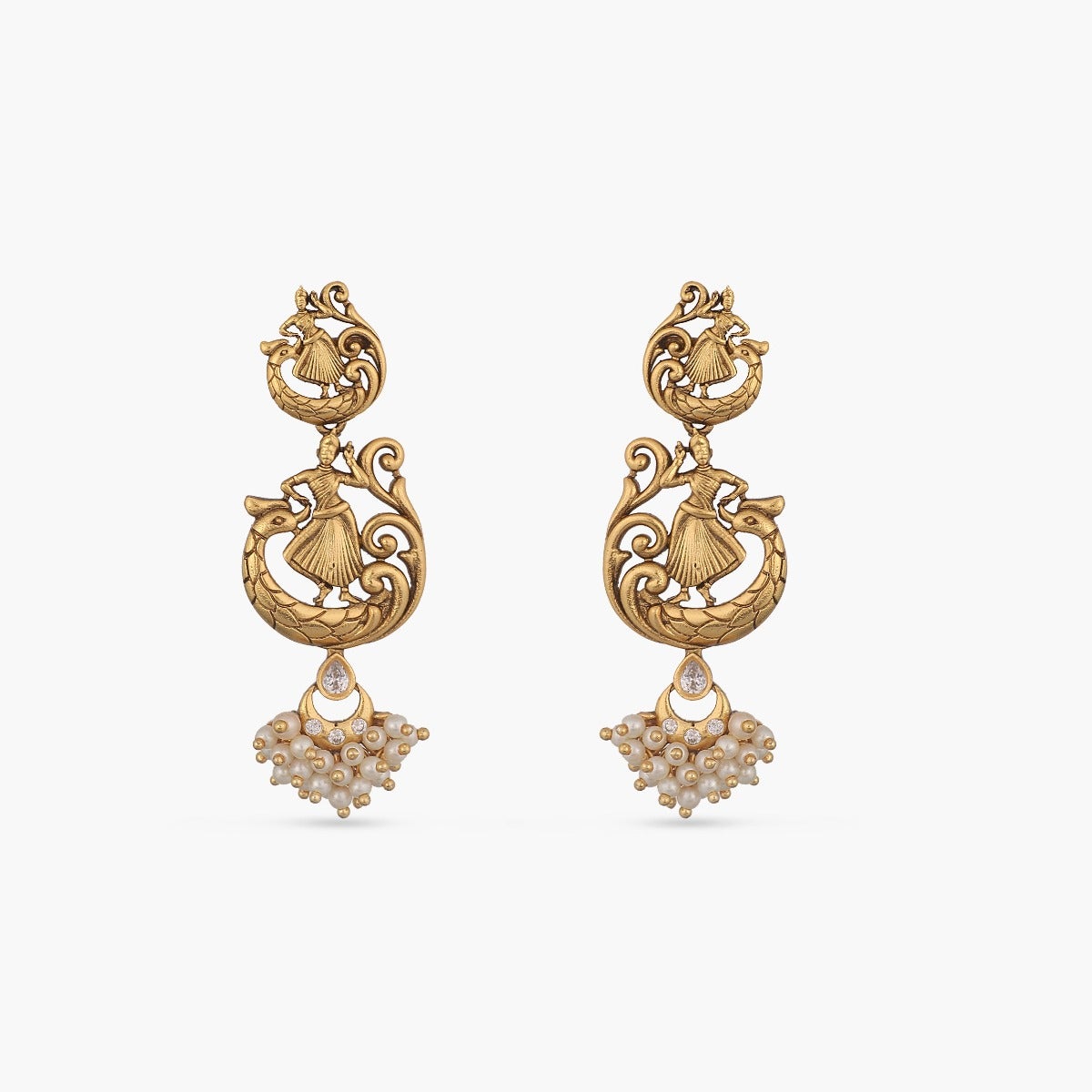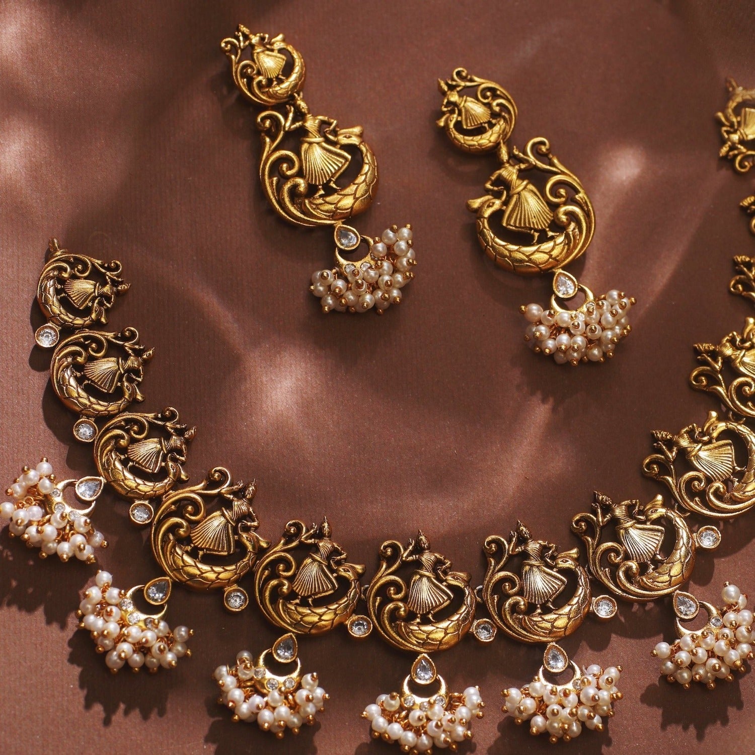 This is one of our most favorite necklace set by Tarinika. It represents timeless elegance and beautiful craftsmanship. It features dancing lady motifs and peacock motifs all over the necklace. It is crafted with high quality clustered pearls and unique antique gold plating. A true centerpiece to any look for any occasion.