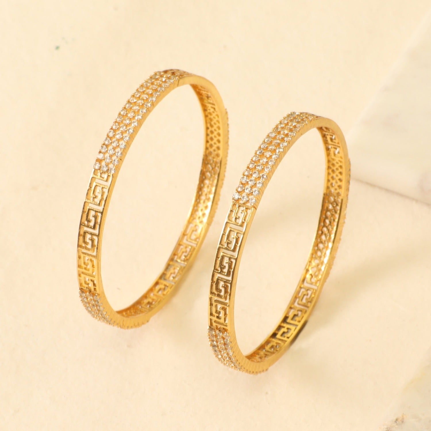 Make your wrist the focus of attraction with this stunning bangles. The design is crafted with brilliant CZ stones and unique geometric patterns making it a perfect addition to match your other similar jewelry.