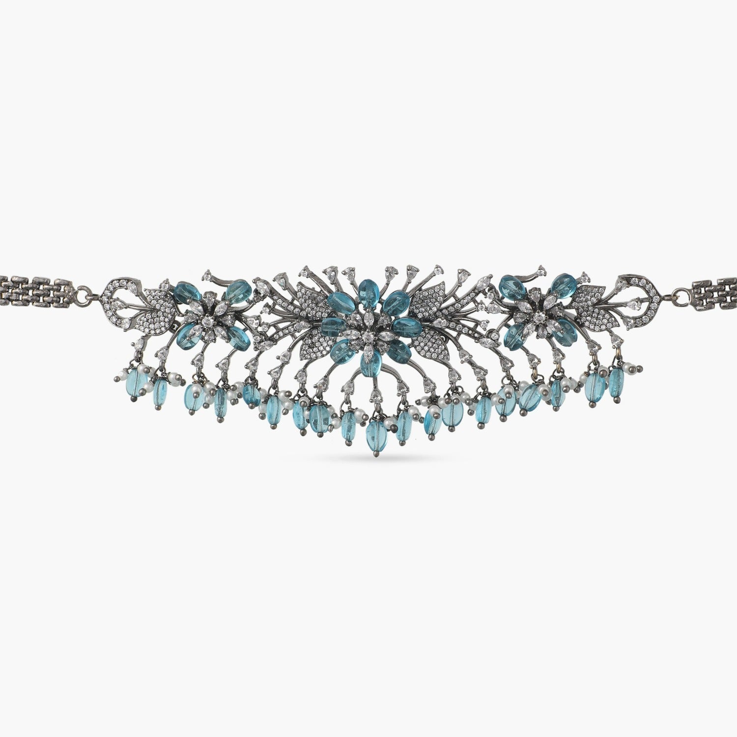 Showcasing blue beryl stones and dazzling CZ jewels, set in a flower bouquet arrangement, this opulent classic choker is a versatile design to pair with any dress. Style it for this festive season or wear it with an evening dress- it will suit both.