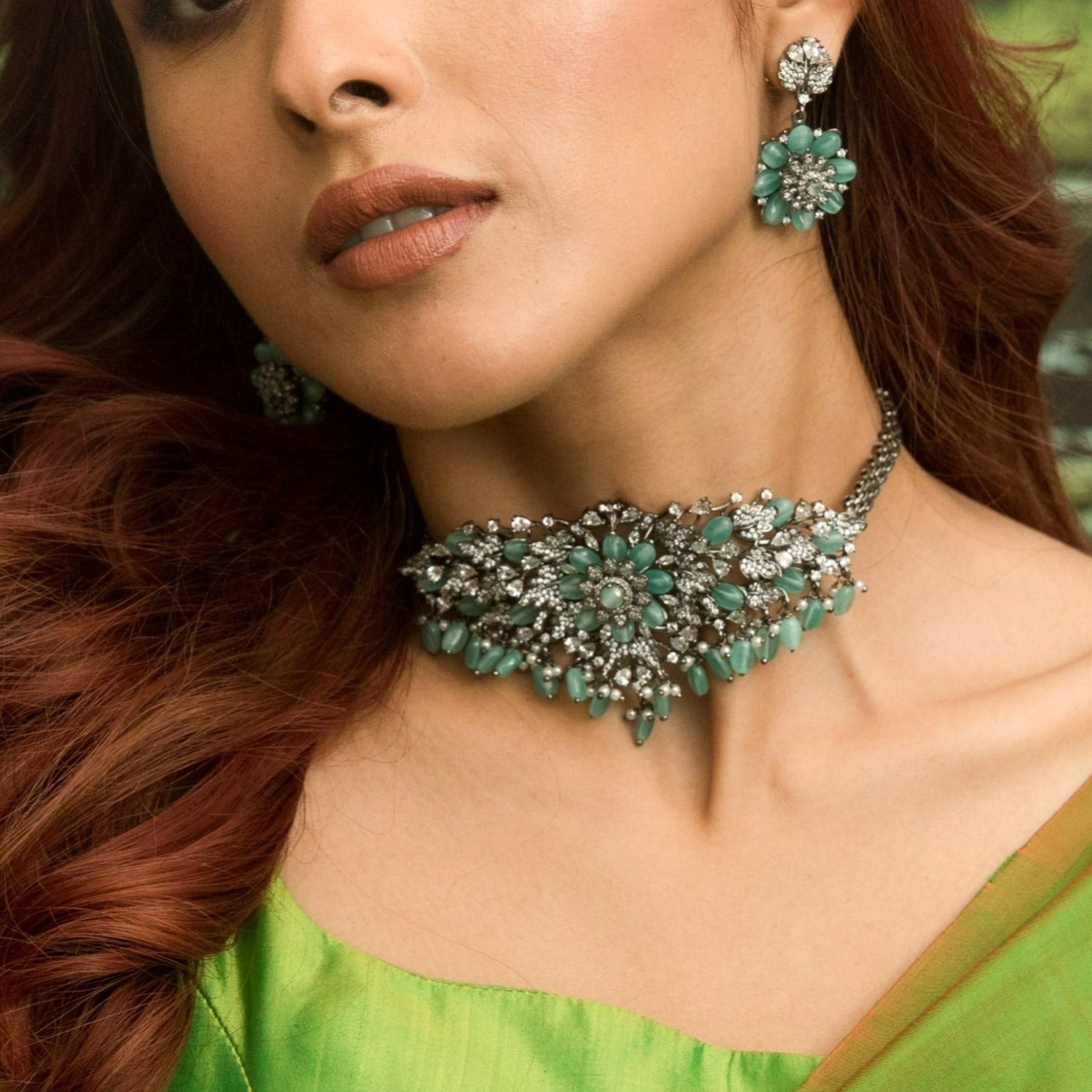 Introducing a floral blush choker set featuring mint green beryl stones arranged with dazzling CZ stones at the center set in a floral bouquet arrangement. This choker set exudes timeless sophistication and charm, making it a versatile choice for every special event.
