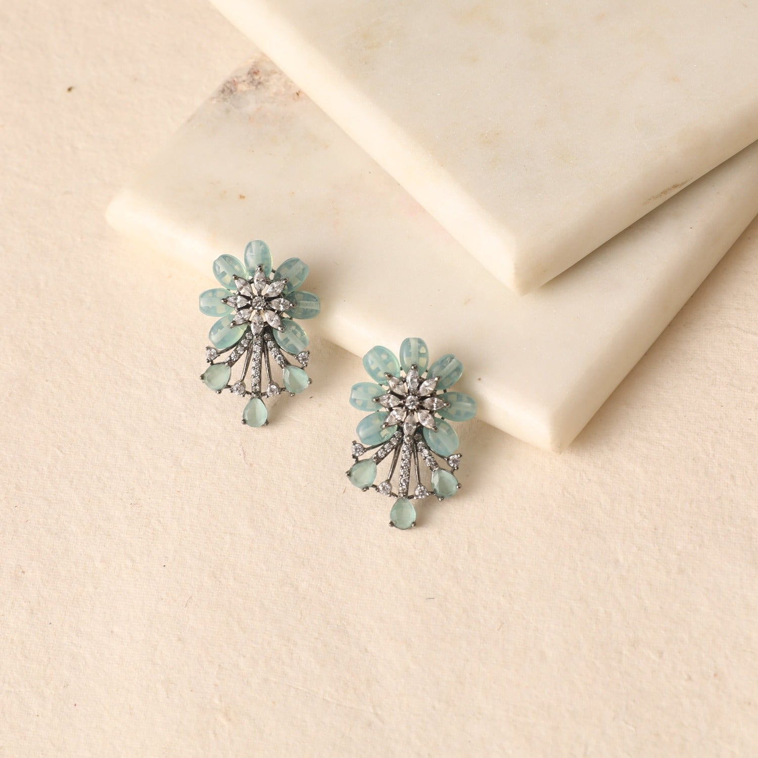 Introducing floret drop earrings showcasing blue beryl stones arranged with dazzling CZ stones at the center set in a floral arrangement. These earrings exude timeless sophistication and charm, making them a remarkable choice.