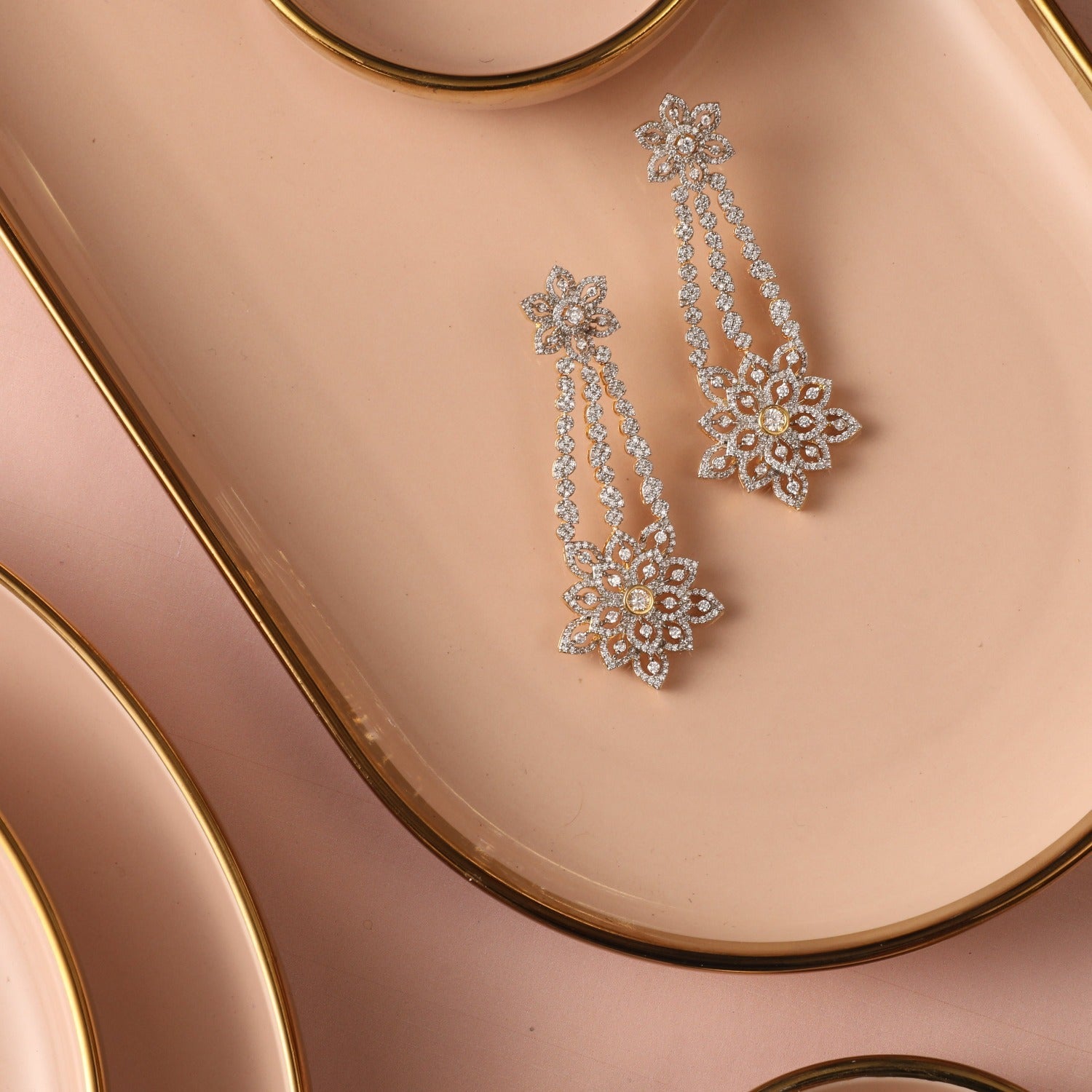 These exquisite drop earrings with gold polish feature radiant CZ stones. Elegant floral designs suit any outfit or coordinate with other CZ jewelry for a refined look.