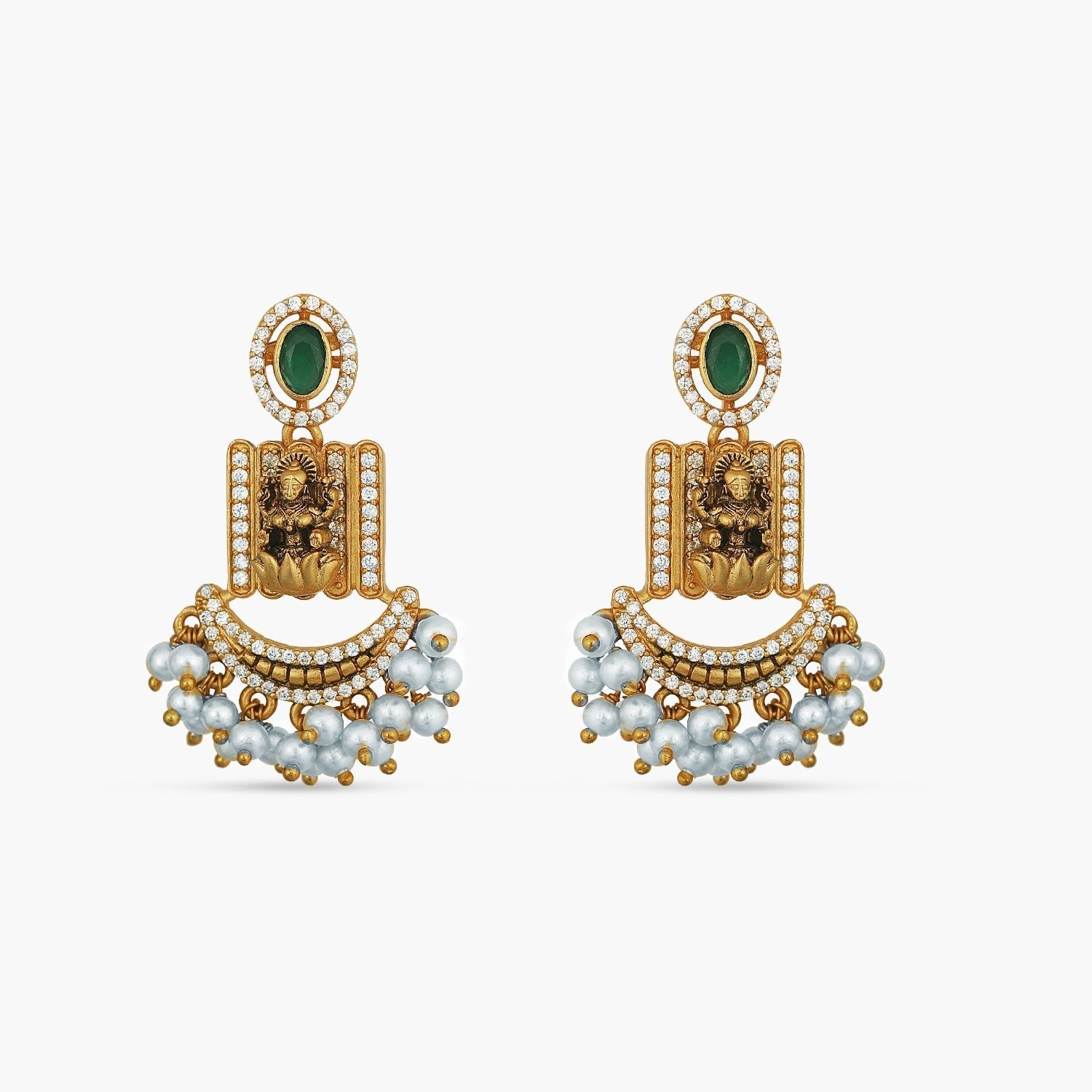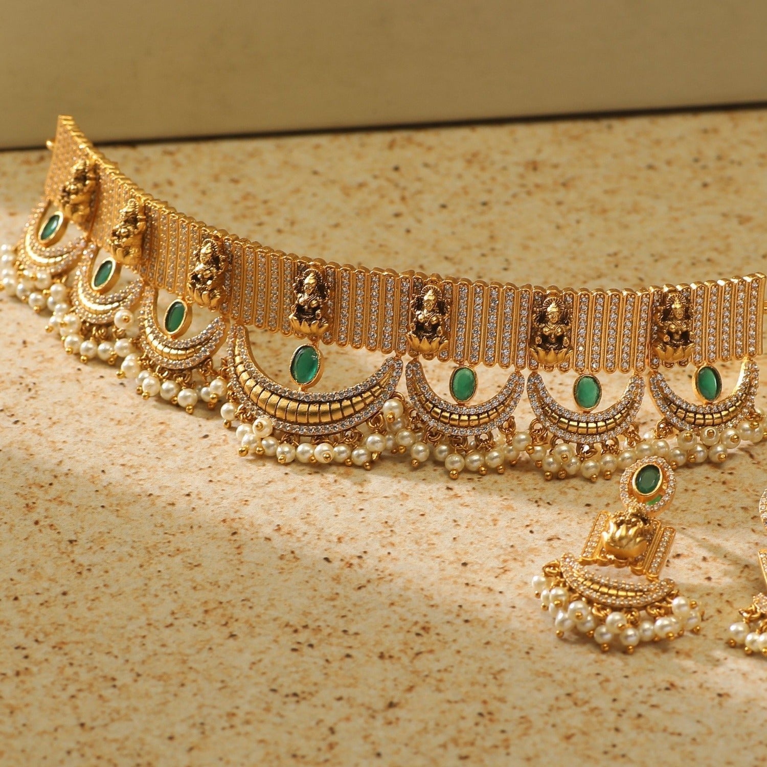 Classic traditional meets modern design ¨C this temple inspired Tarinika antique choker set is a perfect expression of high-quality unique designs. Our creative team always tries to take Indian traditional jewelry to next level to keep up with the fashion trends. The beautiful shape, goddess Laxmi motifs and the bunch of pearls add richness to the design. Delightful details with AAA quality CZ stones make this masterpiece the perfect choice for elegant outfits. A great choice for special occasions.