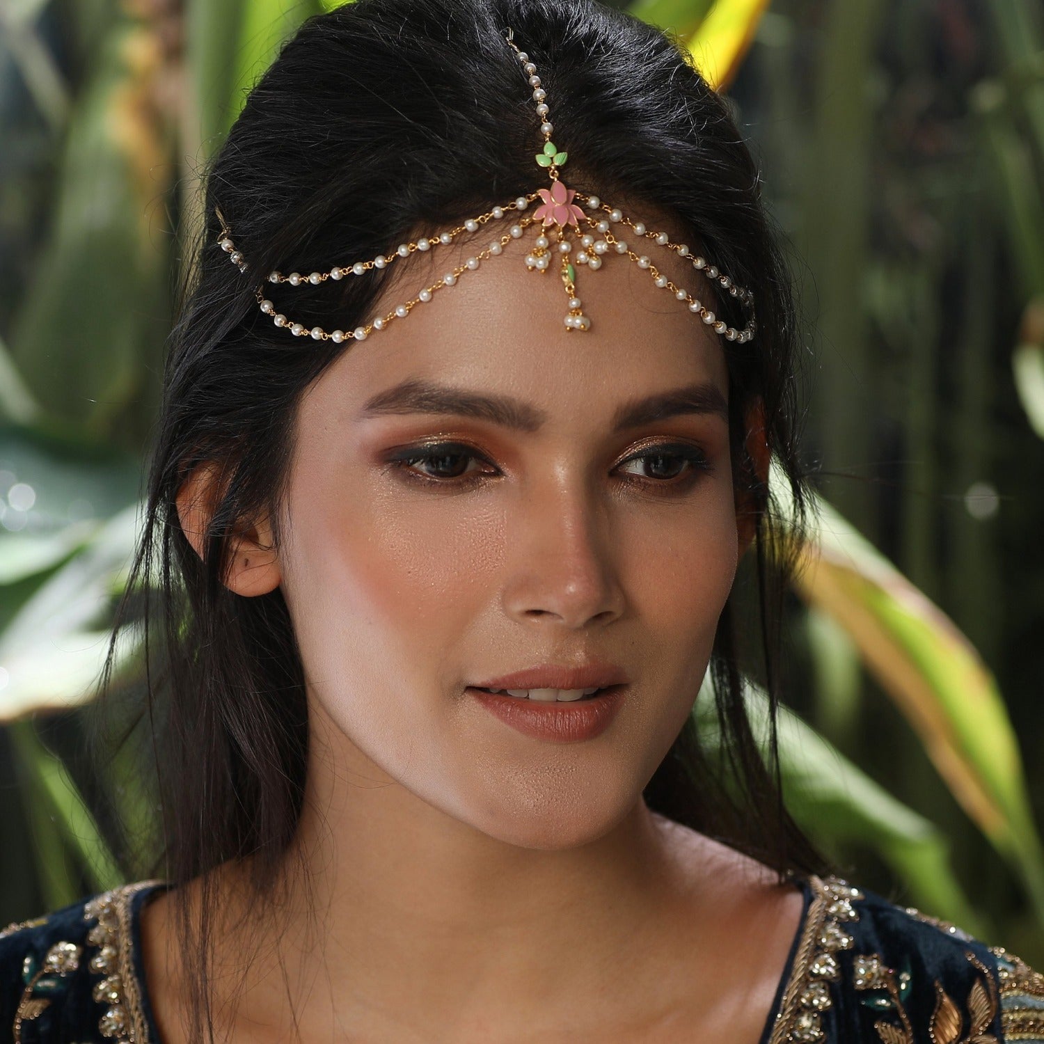 Jalaja Collection by Tarinika is inspired by the Lotus florals and pearls from ocean. Our creative team worked on charming gold-plated jewelry with Lotus motifs, hand painted with beautiful pastel hued enamel and delicate elegance of hand-woven pearl chains. This matha patti is effortlessly chic. This makes a great addition to festive or weddings.