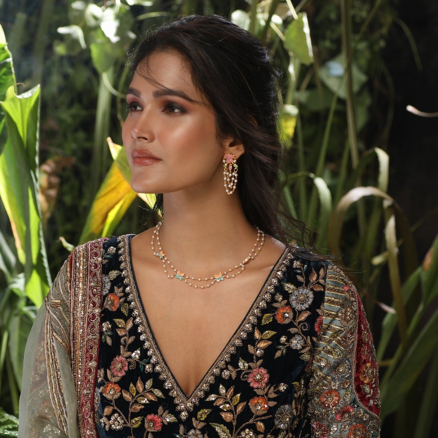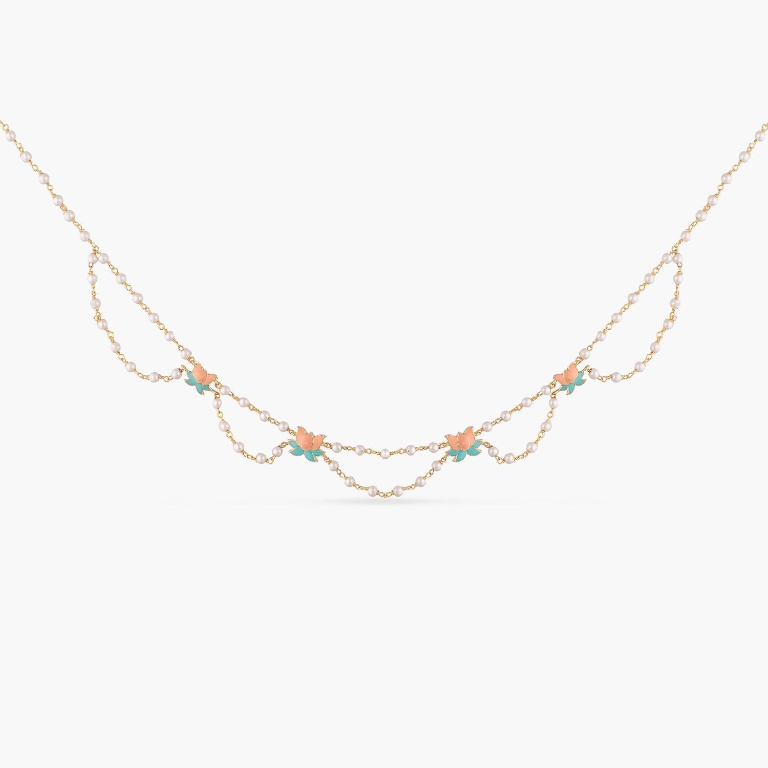 Jalaja Collection by Tarinika is inspired by the Lotus florals and pearls from the ocean. Our creative team worked on charming gold-plated jewelry with Lotus motifs, hand-painted with beautiful pastel-hued enamel and delicate elegance of hand-woven pearl chains. This enamel pearl necklace is effortlessly chic. This makes a great addition to festive or weddings.