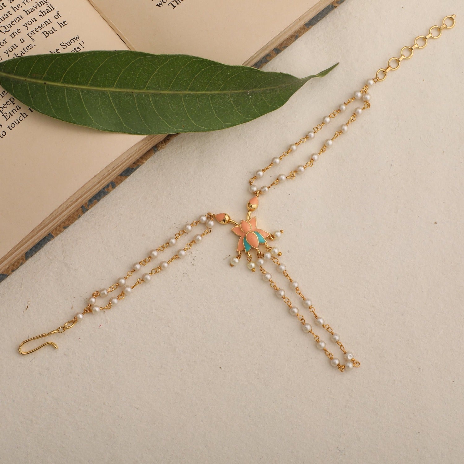 Jalaja Collection by Tarinika is inspired by the Lotus florals and pearls from the ocean. Our creative team worked on charming gold-plated jewelry with Lotus motifs, hand-painted with beautiful pastel-hued enamel and delicate elegance of hand-woven pearl chains. This hand chain is a part ring and part bracelet and is effortlessly chic. This makes a great addition to your bridal accessories.