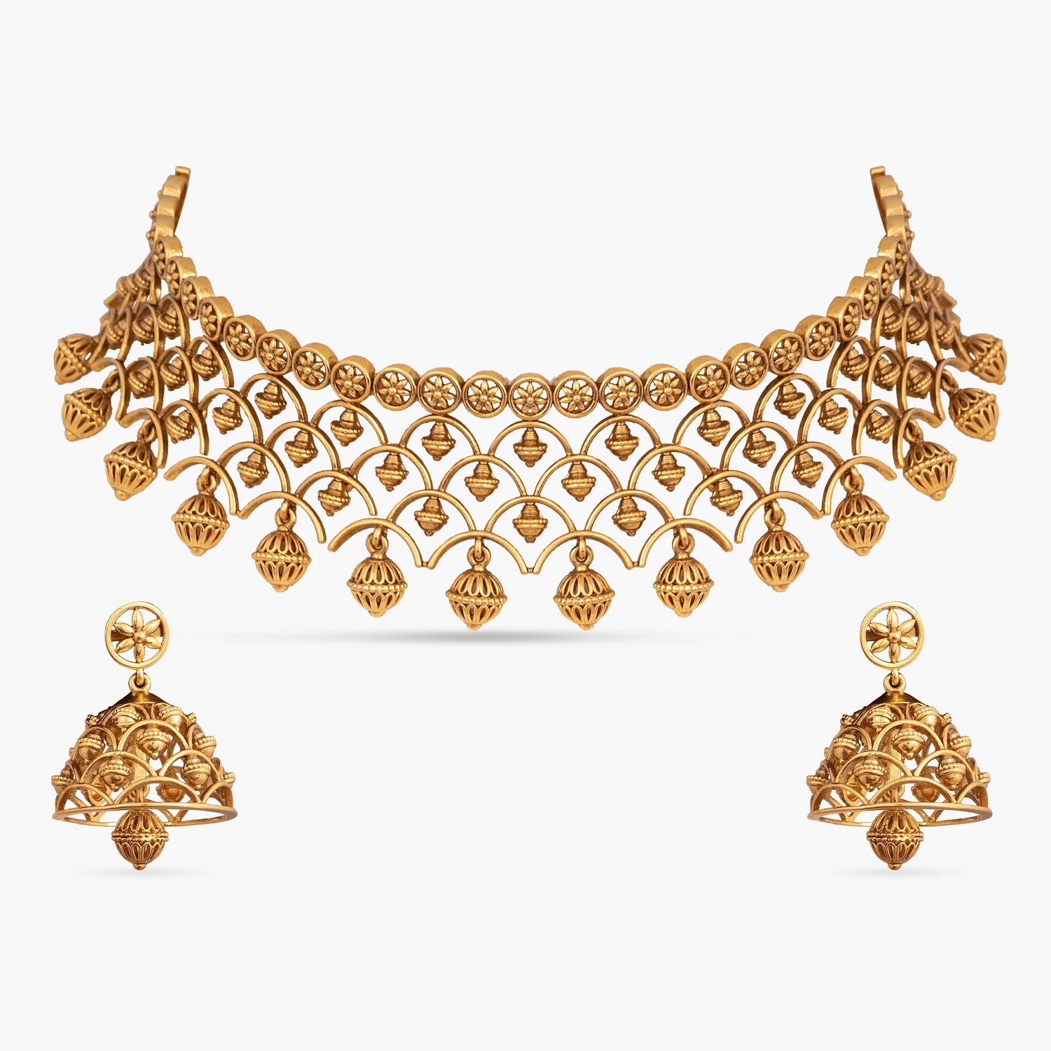 This gorgeous yet simple choker set is designed for day events. The Kumud Choker from Tarinika Classics is designed with geometric filigree patterns based on antique gold tone with dangling metal balls. Be it a brunch party or a special event - this will be a perfect partner.