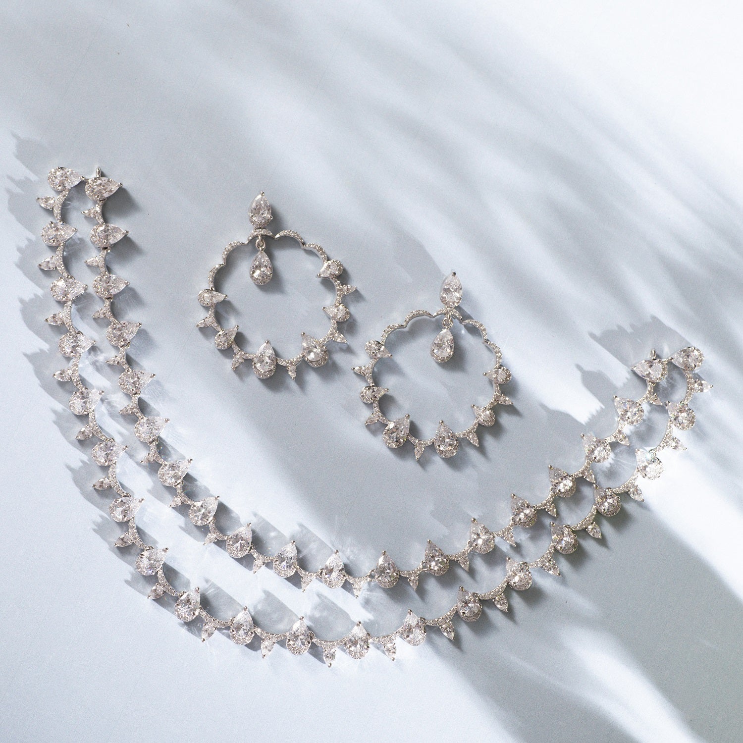 The Niamh Delicate CZ Necklace set will have everyone's eyes on you. The diamond shape design and the circular earrings make a beautiful pair. Handcrafted with delicate CZ stones and silver plating. Wear this necklace set with an elegant dress for your next special event.