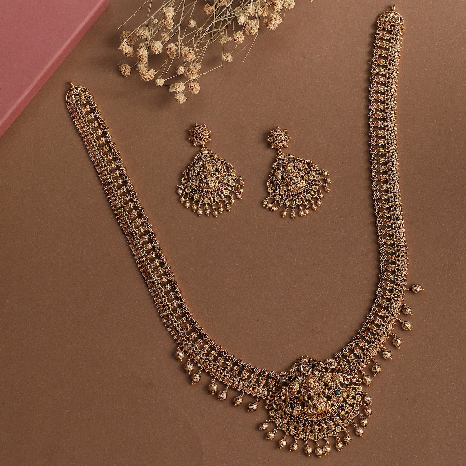 This temple design long necklace by Tarinika features an intricate Goddess Lakshmi design, surrounded by florals and patterns making it grand and dramatic. Detailed with golden drop beads, this necklace is a bold statement piece to add to your Wedding Wishlist.